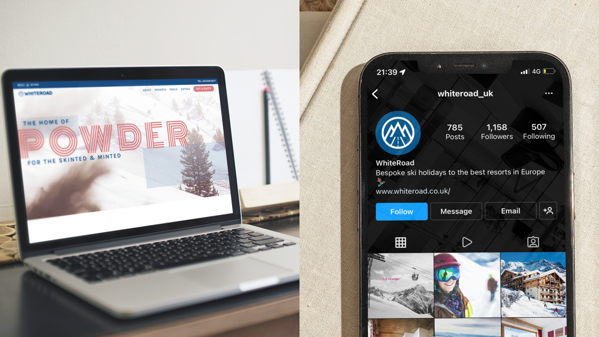 We wanted Whiteroad to appeal to everyone, so a dual colour palette of blue and coral was selected and the logo and accompanying graphic elements were too compliment with sharp lines and clear contrasts. The brand ethos all centred around hand-selected product that caters to every budget. The phrase, ‘ski holidays for the skinted and minted’ was developed to market this.